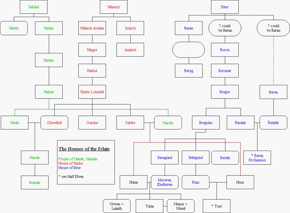 Torunları Númenórlular, daha da kutsanmış ve yüceltilmişti. İlk kral Yarı Elf Elros, Edain ve Eldar arasındaki iki birleşmenin soyundan geliyordu.